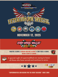 November 11, 2025 – San Diego, CA…The Supermodified Ultimate Pavement Racing Series, (SUPRS), Veterans Day Special supermodified sim race pays tribute to all United States Armed Forces veterans on November 12, 2025, at New River Valley Speedway. Time Trials, a Fast Car Dash, Heat Races and the 75 lap NASCAR Heat supermodified sim racing feature are all on the schedule for this time honored race that dates back to 2008. This year’s event will mark… Keep Reading