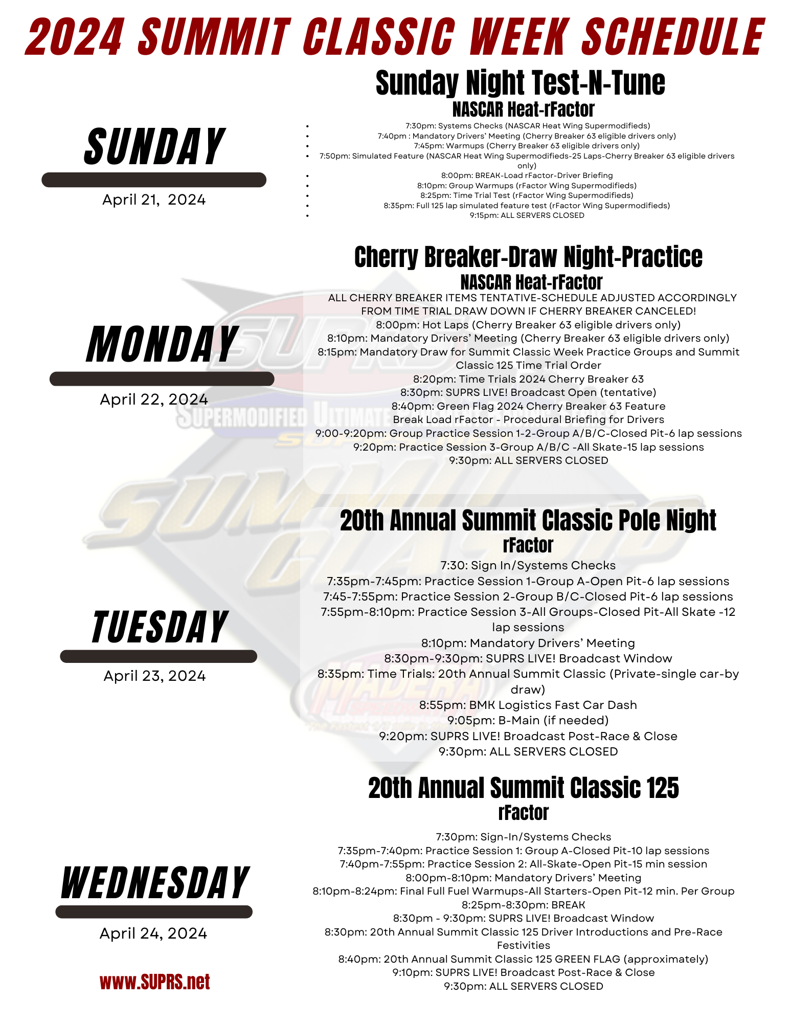 ***2024 20th Annual Summit Classic 125 Schedule of Events***