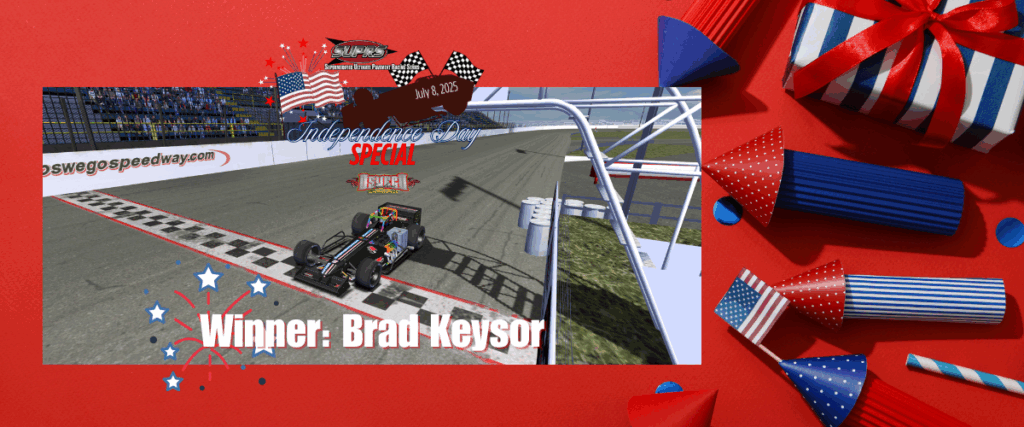 July 8, 2025 – Oswego, NY…Liverpool, New York’s Brad Keysor won the Supermodified Ultimate Pavement Racing Series, (SUPRS), Independence Day Special 35 lap feature for non-wing supermodified sim racing Tuesday. Keysor led the last 14 laps, taking his second checkered flag of the short summer season over Hoosier native Bob Gangwer by more than five seconds. Gangwer, who led 15 laps had to slow in the late stages of the race to keep from blowing a tire. Brian Strickland of MI rallied to finish third after dropping back at the start. It was Strickland’s his first feature podium at Oswego in a long time, and he nearly passed the ailing Gangwer at the line.