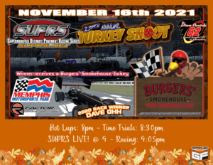 Next Tuesday, the SUPRS racers bring out the big guns as they go on the hunt for a Burgers’ Smokehouse Turkey in the 17th Annual Turkey Shoot at Memphis Motorsports Park. The popular race awards the winner a Burgers’ Smokehouse Turkey delivered to their doorstep in time for Thanksgiving.
