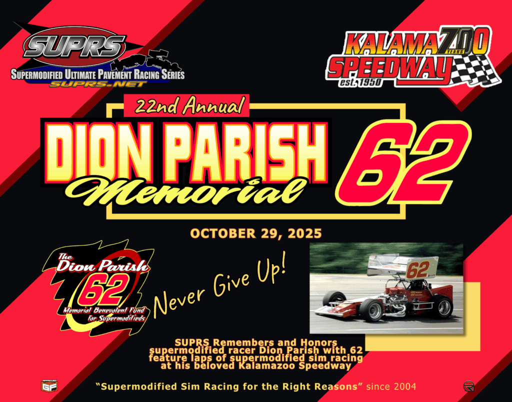October 28, 2025 – Goshen, IN…The Supermodified Ultimate Pavement Racing Series, (SUPRS), honors the memory of the supermodified racer that would “Never Give Up” the late Dion Parish with the running of the 22nd Annual Dion Parish Memorial October 29, 2025 at Kalamazoo Speedway.